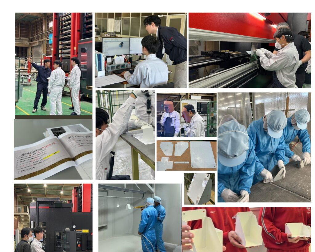 会社の概要説明から始まり安全教育・3DCADを使用した設計・鋼材の抜き・曲げ・溶接・塗装・組立・品質保証